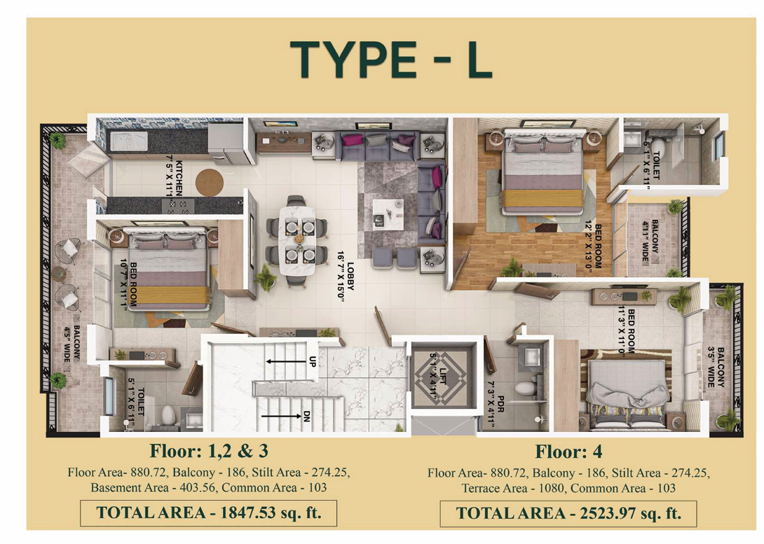- 1st to 3rd Floors: 1848 β 1967 Sq.ft.